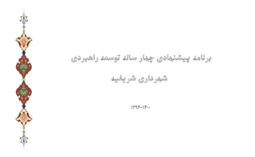 برنامه پيشنهادي ۴ ساله توسعه راهبردي شهرداري شريفيه جهت اطلاع عموم مردم شريف در سايت شهرداري قرار داده شده است. علاقمندان ميتوانند نقطه نظرات و پيشنهادات خود را تا تاريخ ۹۶/۰۹/۲۵ به شماره ۳۰۰۰۴۵۸۵ پيامك نموده و يا بصورت مكتوب به واحد روابط عمومي شهرداري ارائه نمايند. برنامه پیشنهادی توسعه راهبردی چهار ساله